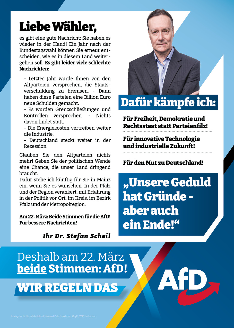 Der Landtag in Mainz braucht Abgeordnete, die komplexe Zusammenhänge verstehen und den Mut haben, auch unbequeme Fragen zu stellen. Stefan Scheil steht für eine sachorientierte Opposition mit Substanz und Standhaftigkeit.